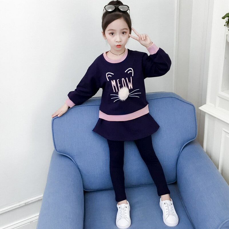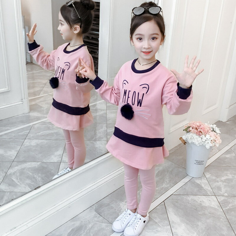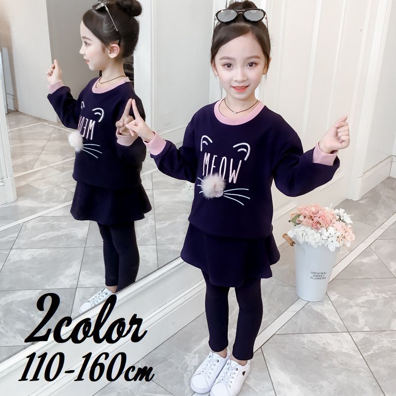 送料無料セットアップ 上下2点セット 子供服 キッズ ジュニア 長袖トレーナー カットソー スカッツ スカート付レギンス ネコ かわいい